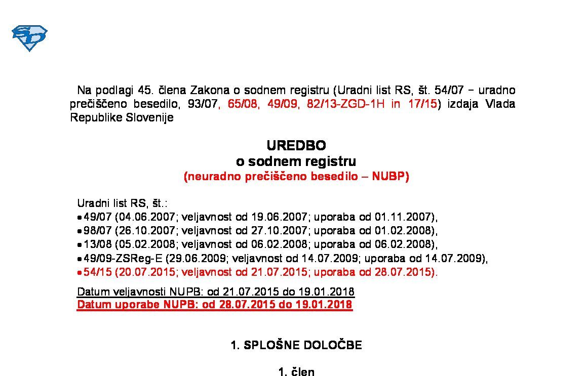 | Uredba o sodnem registru (NUPB - neuradno prečiščeno besedilo) | 10.08.2024 | [!] | 01.08.2024 | |