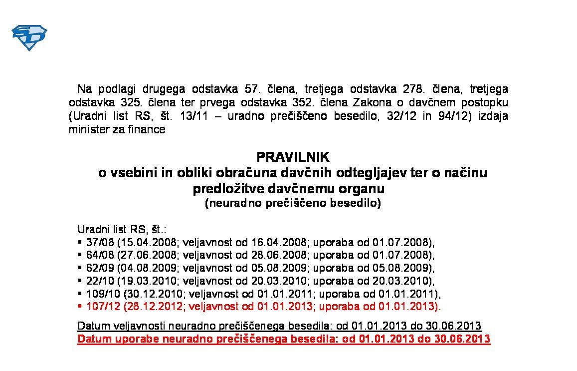 | Pravilnik o dostavi podatkov za odmero dohodnine ('dostava-obdavčljivi dohodki' - neuradno prečiščeno besedilo) | 01.01.2025 | [!] | 26.11.2025 | |