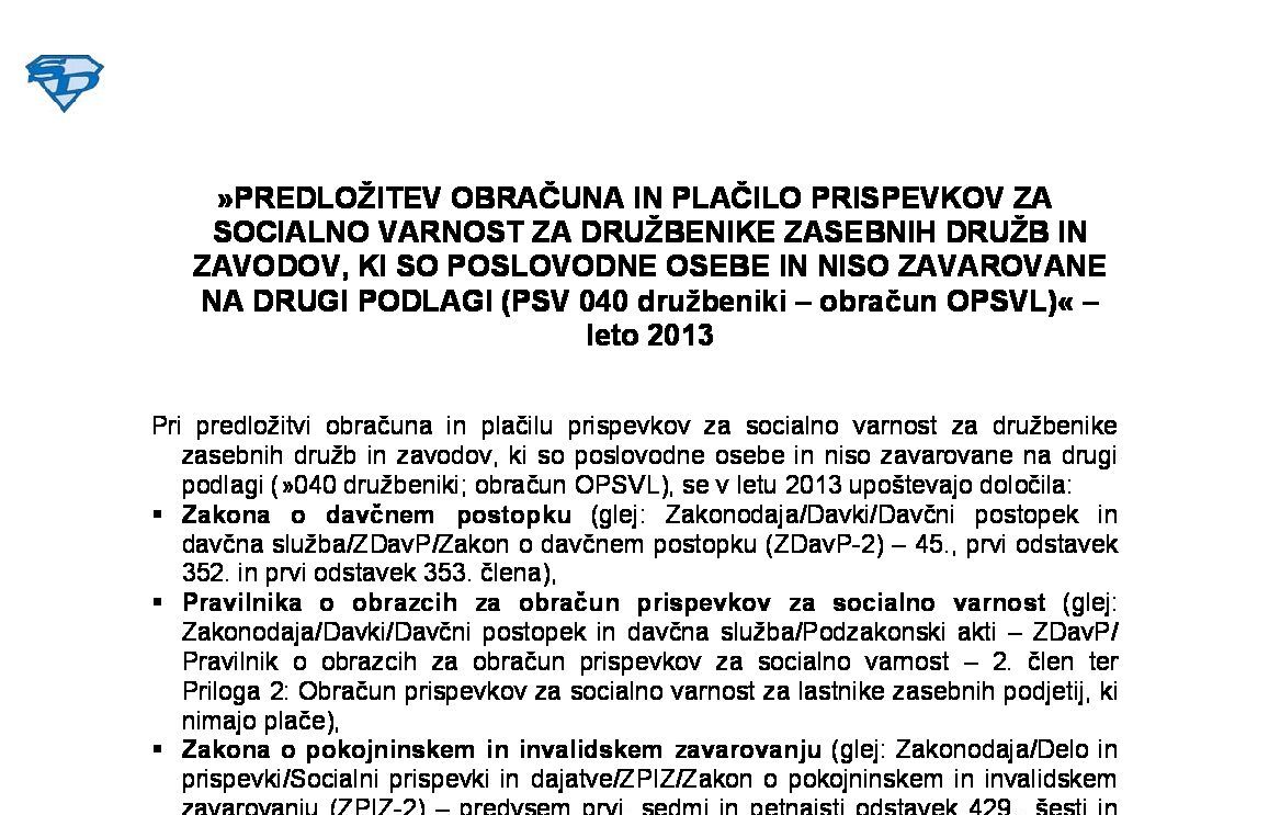 PREDLOŽITEV OBRAČUNA IN PLAČILO PRISPEVKOV ZA SOCIALNO VARNOST ZA DRUŽBENIKE/DELNIČARJE GOSPODARSKIH DRUŽB IN USTANOVITELJE ZAVODOV/ZADRUG, KI SO POSLOVODNE OSEBE IN NISO ZAVAROVANE NA DRUGI PODLAGI (PSV 040 družbeniki – obračun OPSVL) – leto 2026 13.01.2026