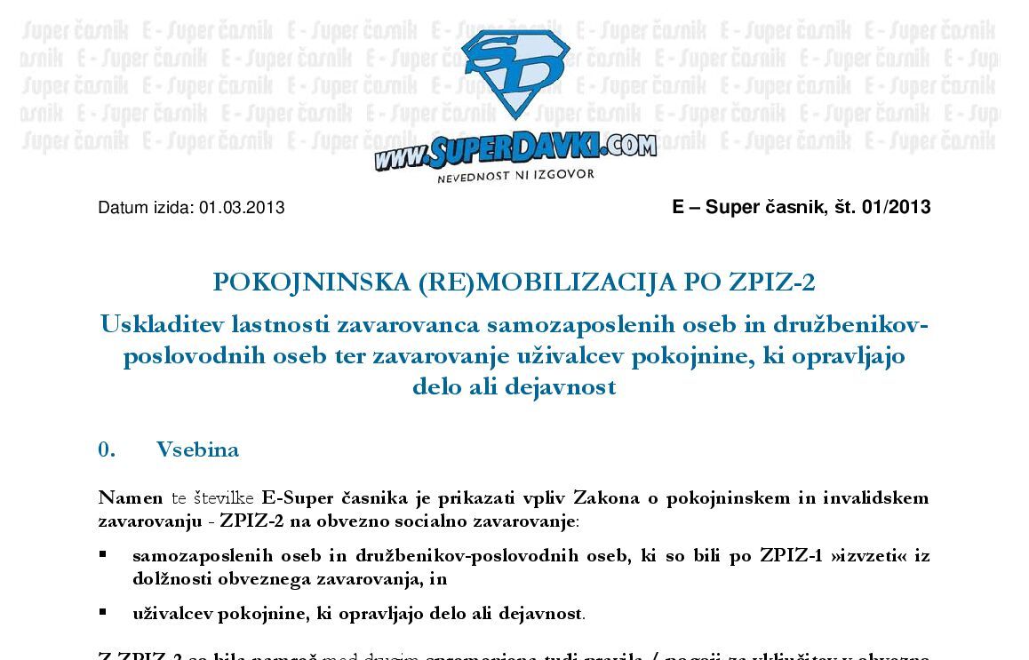 E-Super časnik je z dne 12.03.2013 dopolnjen - dodatek v povezavi z odmero prečasne pokojnine (38. člen ZPIZ-2). E-Super časnik, številka 01/13.pdf