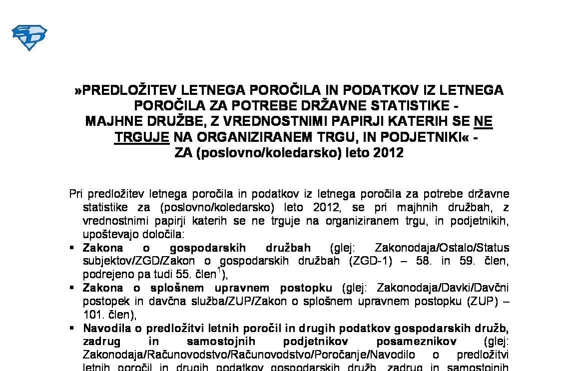 PREDLOŽITEV LETNEGA POROČILA IN PODATKOV IZ LETNEGA POROČILA ZA POTREBE DRŽAVNE STATISTIKE – MAJHNE DRUŽBE, Z VREDNOSTNIMI PAPIRJI KATERIH SE NE TRGUJE NA ORGANIZIRANEM TRGU, IN PODJETNIKI - ZA (poslovno/koledarsko) leto 2024 31.01.2025