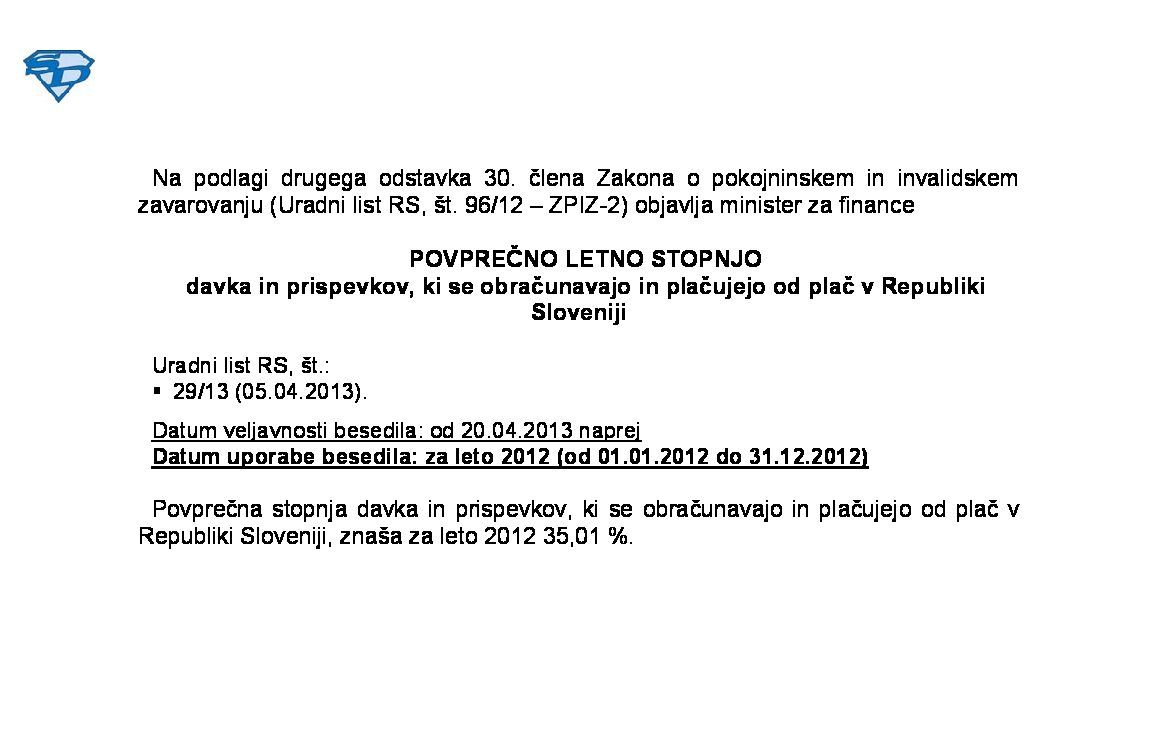 | Povprečna letna stopnja davka in prispevkov, ki se obračunavajo in plačujejo od plač v Republiki Sloveniji (leto 2023) | 01.01.2023 | 31.12.2023 | 11.03.2024 | |