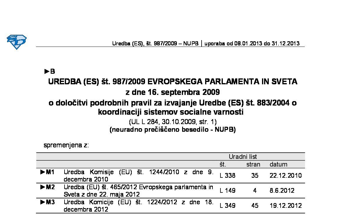 Uredba (ES) št. 987/2009 se je začela uporabljati 01.05.2010 in je nadomestila Uredbo 574/72 - objavljeno prečiščeno besedilo (NUPB) Uredbe se uporablja skladno z zadnjim popravkom od 08.01.2013 naprej.