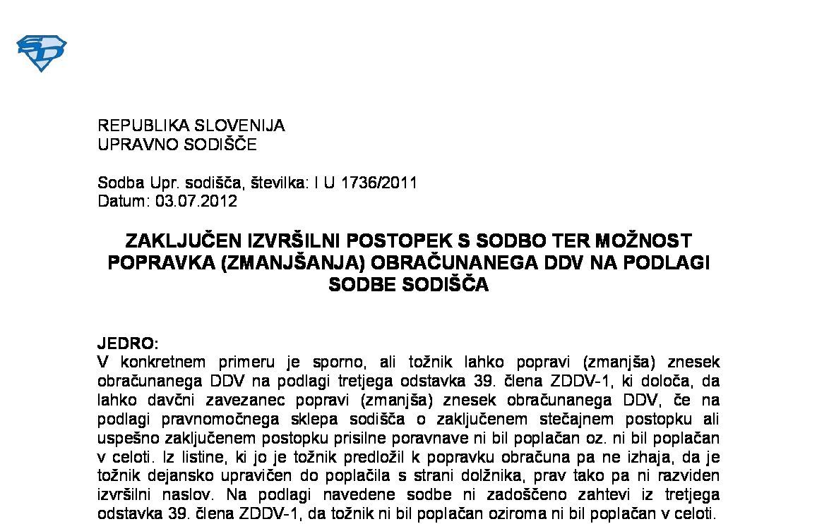 IZPOLNJEVANJE POGOJEV ZA DOBAVO BLAGA ZNOTRAJ UNIJE, OPROŠČENO PLAČILA DDV NA PODLAGI 46. ČLENA ZDDV-1 – Nepopolne CMR listine (I U 1704/2021-38) 27.11.2024 15.10.2025