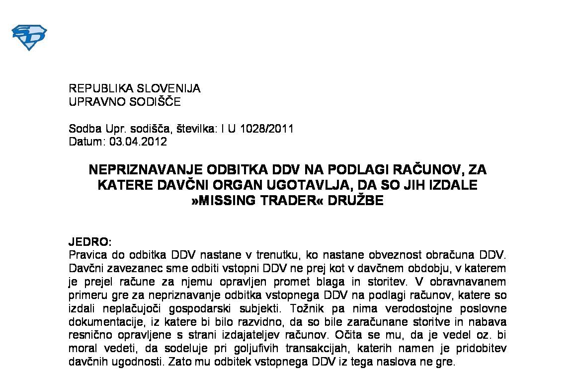 IZPOLNJEVANJE POGOJEV ZA DOBAVO BLAGA ZNOTRAJ UNIJE, OPROŠČENO PLAČILA DDV NA PODLAGI 46. ČLENA ZDDV-1 – Nepopolne CMR listine (I U 1704/2021-38) 27.11.2024 15.10.2025