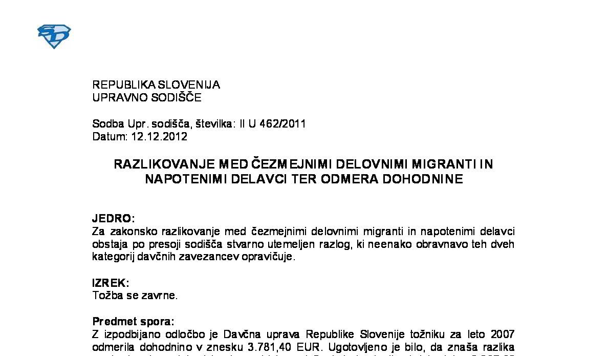 DOHODEK IZ DELOVNEGA RAZMERJA – Čezmejni delovni migrant – Stroški prehrane med delom (II U 195/2022-15) 30.09.2025 05.12.2025