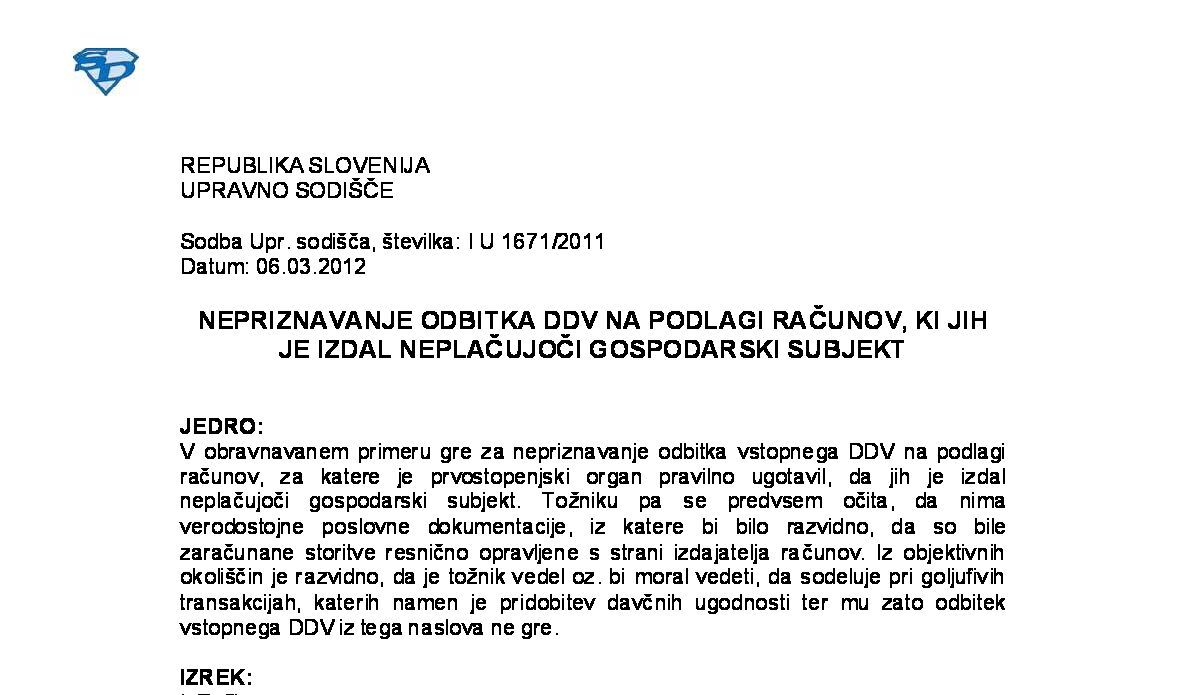 IZPOLNJEVANJE POGOJEV ZA DOBAVO BLAGA ZNOTRAJ UNIJE, OPROŠČENO PLAČILA DDV NA PODLAGI 46. ČLENA ZDDV-1 – Nepopolne CMR listine (I U 1704/2021-38) 27.11.2024 15.10.2025