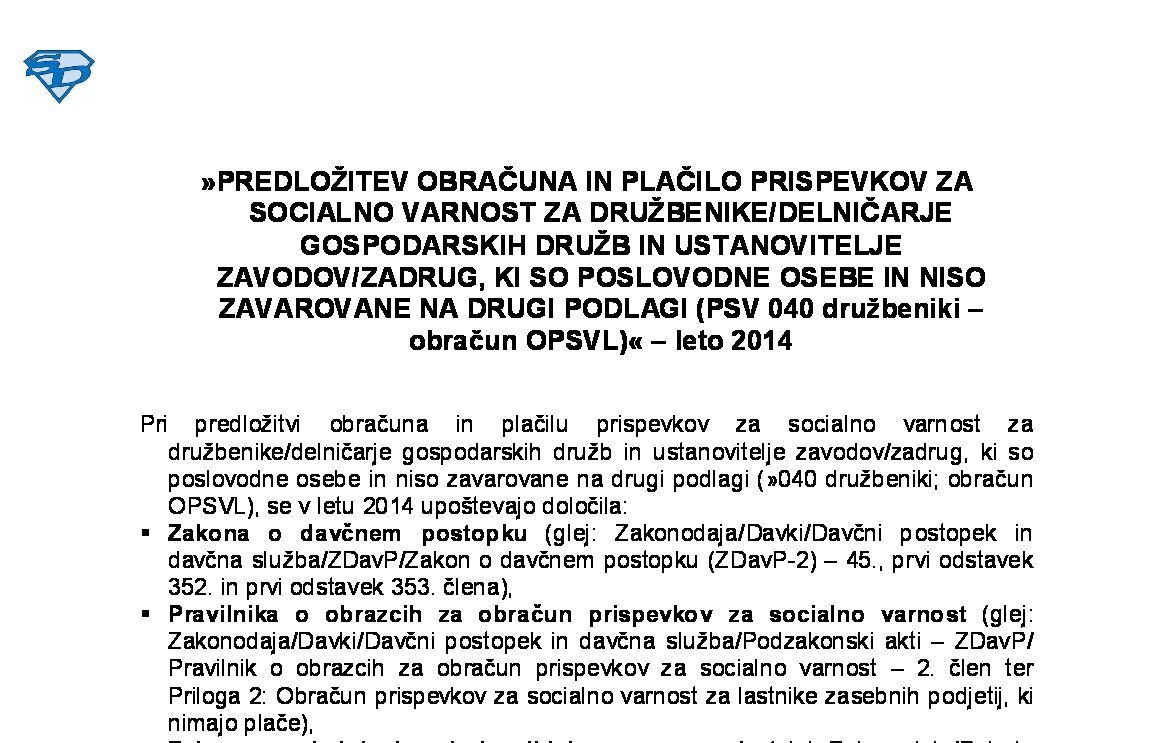 PREDLOŽITEV OBRAČUNA IN PLAČILO PRISPEVKOV ZA SOCIALNO VARNOST ZA DRUŽBENIKE/DELNIČARJE GOSPODARSKIH DRUŽB IN USTANOVITELJE ZAVODOV/ZADRUG, KI SO POSLOVODNE OSEBE IN NISO ZAVAROVANE NA DRUGI PODLAGI (PSV 040 družbeniki – obračun OPSVL) – leto 2026 13.01.2026