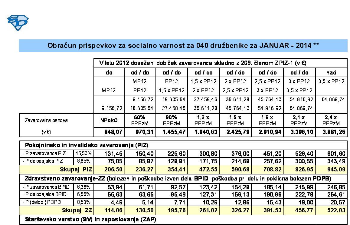 Prvotno objavo z dne 31.01.2014 (v prilogi) dopolnjujemo/popravljamo - skladno z določili materialnih predpisov razlika v delu zneska za najnižjo predpisano zavarovalno osnovo za 040 družbenike, ki so se tako zavarovali pred 01.01.2014 oz. od 01.01.2014 naprej.