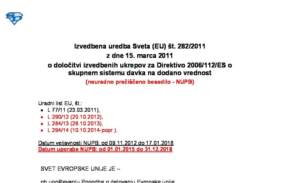 IZVEDBENA UREDBA SVETA (EU) št. 282/2011 z dne 15. marca 2011 o določitvi izvedbenih ukrepov za Direktivo 2006/112/ES o skupnem sistemu davka na dodano vrednost (neuradno prečiščeno besedilo - NUPB) 14.04.2025 02.07.2025
