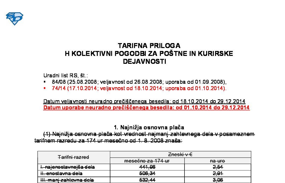 Posebnost glede uporabe TP h KP - spremembe in dopolnitve TP h KP za poštne in kurirske dejavnosti se začnejo uporabljati od prvega dne v naslednjem mesecu po objavi v UL RS (tj. 01.11.2014), razen sprememb glede najnižjih osnovnih plač po tarifnih razredih, ki se uporabljajo od 01.10.2014 naprej. |