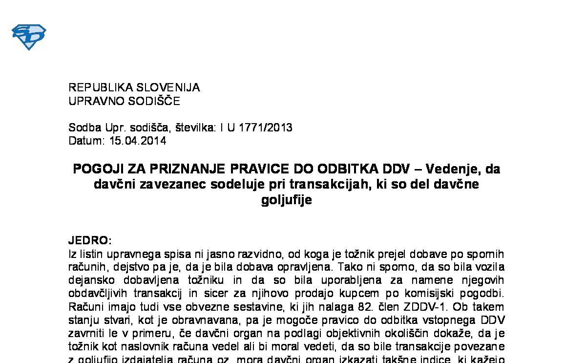 IZPOLNJEVANJE POGOJEV ZA DOBAVO BLAGA ZNOTRAJ UNIJE, OPROŠČENO PLAČILA DDV NA PODLAGI 46. ČLENA ZDDV-1 – Nepopolne CMR listine (I U 1704/2021-38) 27.11.2024 15.10.2025
