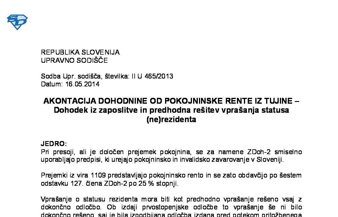 UGOTAVLJANJE REZIDENTSKEGA STATUSA – Dvojno rezidentstvo – Rezidentstvo po KIDO in po ZDoh-2 ( I U 609/2021-7) 17.05.2024 10.06.2025