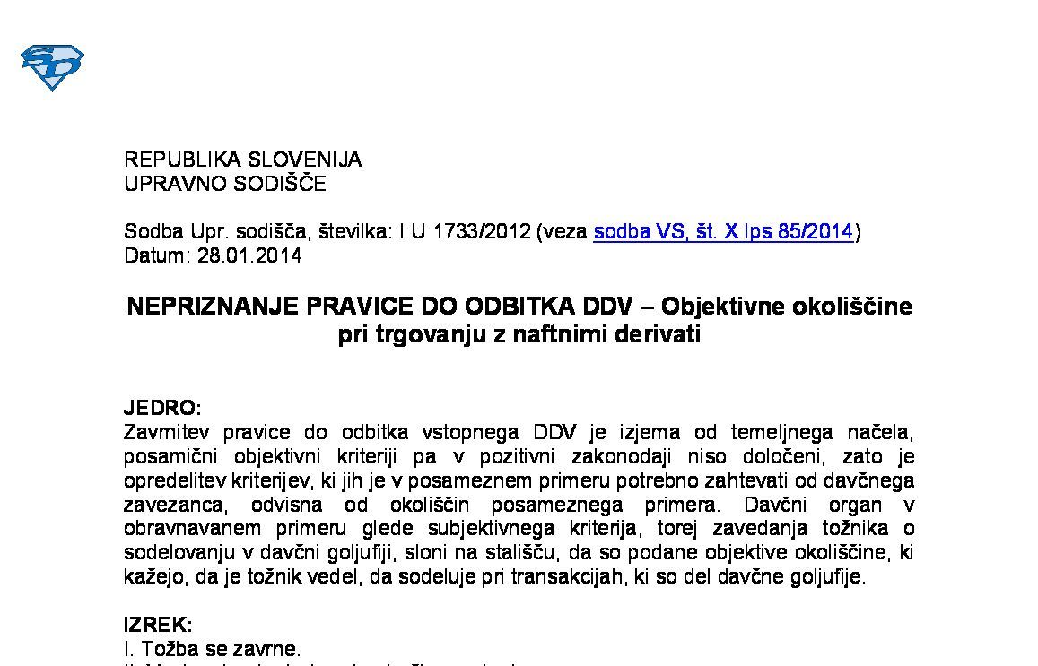 IZPOLNJEVANJE POGOJEV ZA DOBAVO BLAGA ZNOTRAJ UNIJE, OPROŠČENO PLAČILA DDV NA PODLAGI 46. ČLENA ZDDV-1 – Nepopolne CMR listine (I U 1704/2021-38) 27.11.2024 15.10.2025