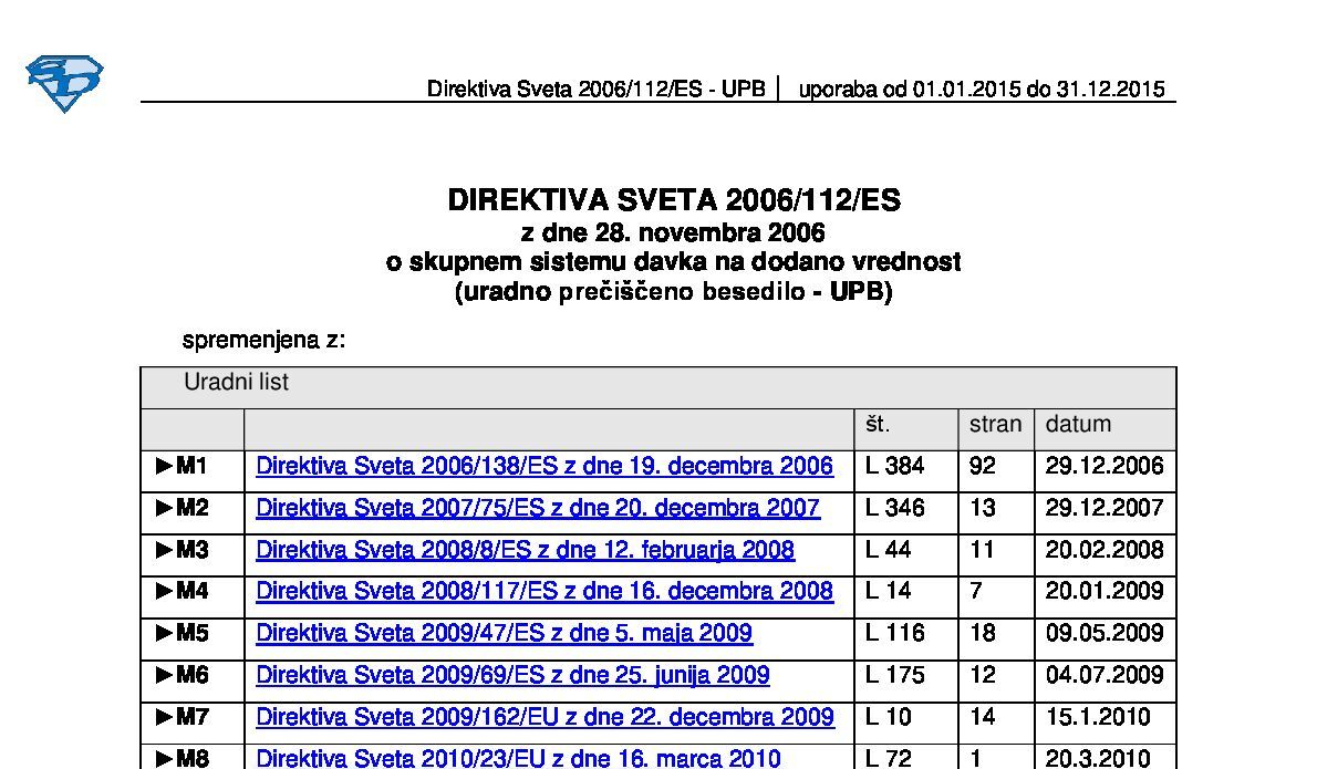 | DIREKTIVA SVETA 2006/112/ES z dne 28.11.2006 o skupnem sistemu DDV (neuradno prečiščeno besedilo - NUPB) | 01.01.2025 | 19.03.2025 | 20.01.2025 | |