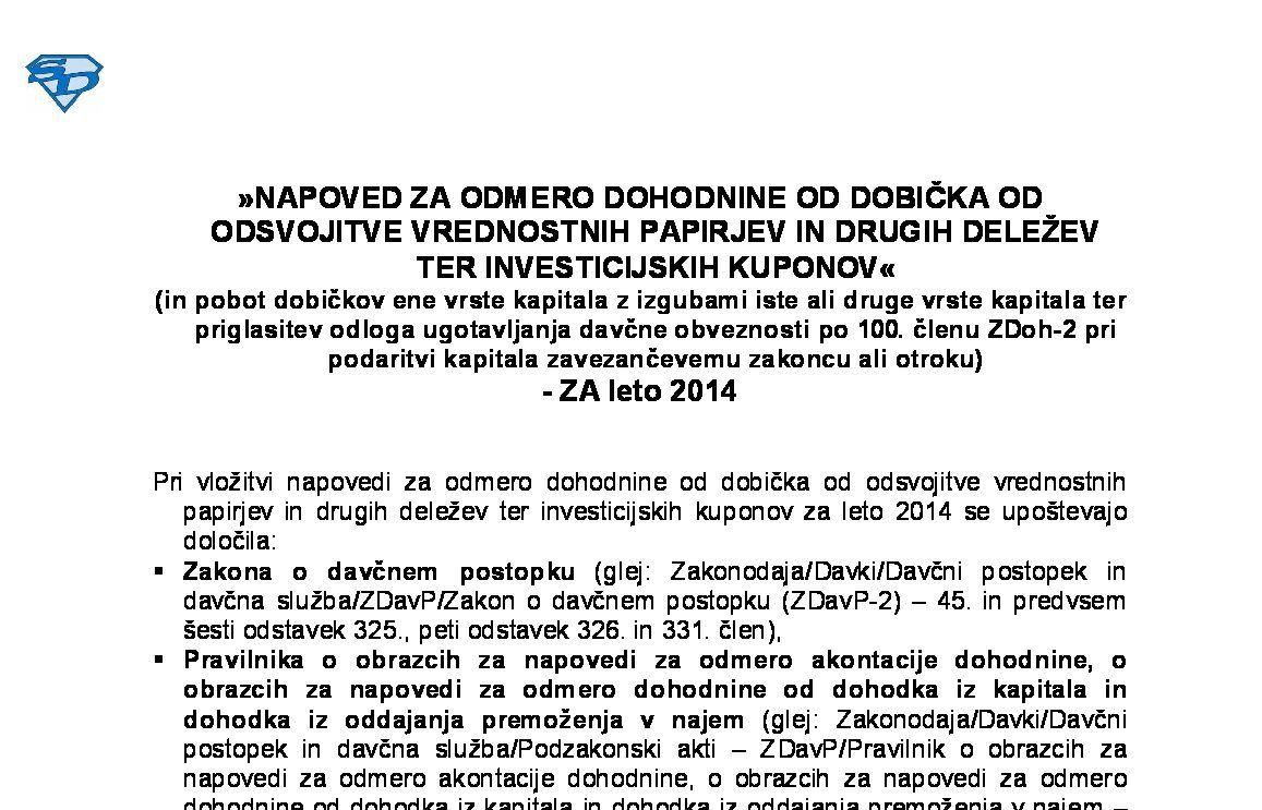 NAPOVED ZA ODMERO DOHODNINE OD DOBIČKA OD ODSVOJITVE VP IN DRUGIH DELEŽEV TER INVESTICIJSKIH KUPONOV (tudi pobot in odlog ugotavljanja) - ZA leto 2025 21.01.2026