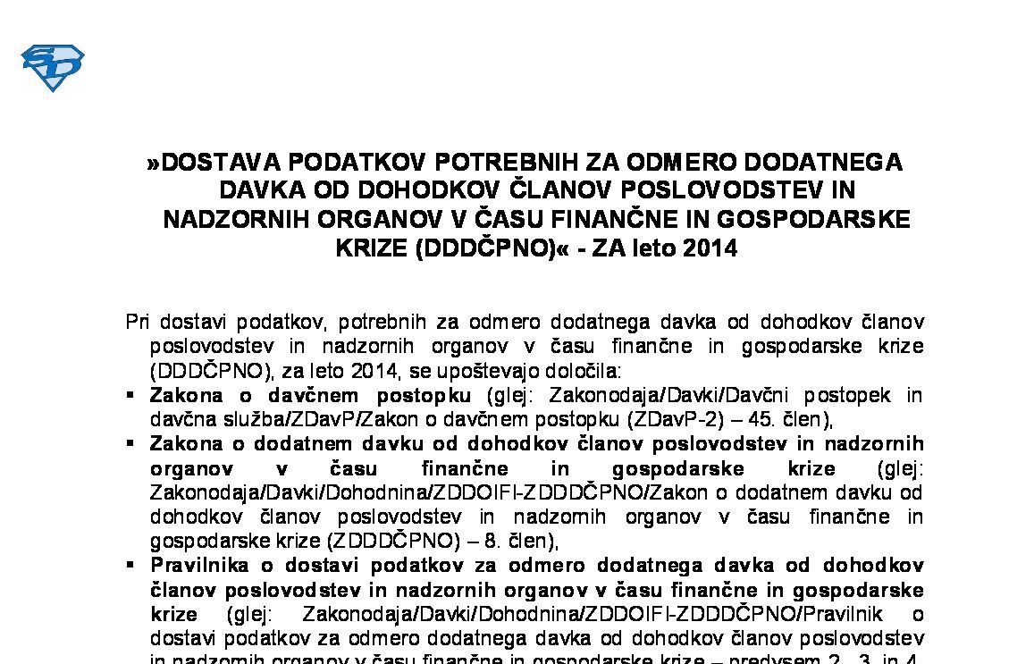 DOSTAVA PODATKOV POTREBNIH ZA ODMERO DODATNEGA DAVKA OD DOHODKOV ČLANOV POSLOVODSTEV IN NADZORNIH ORGANOV (DDDČPNO) V ČASU FINANČNE IN GOSPODARSKE KRIZE - ZA leto 2024 28.01.2025