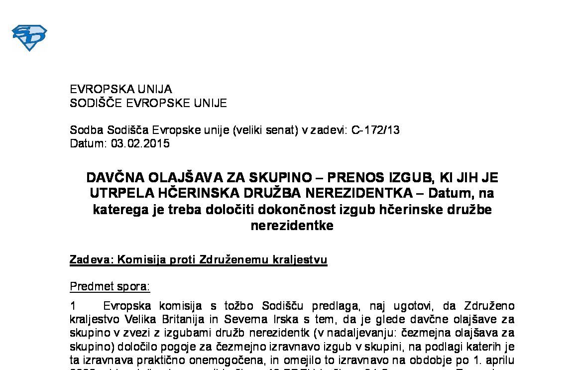 SKUPNI SISTEM OBDAVČITVE MATIČNIH DRUŽB IN ODVISNIH DRUŽB IZ RAZLIČNIH DRŽAV ČLANIC – Oprostitev DDPO od dividend, ki jih odvisna družba nerezidentka razdeli matični družbi rezidentki (C-228/24) 03.04.2025 07.04.2025