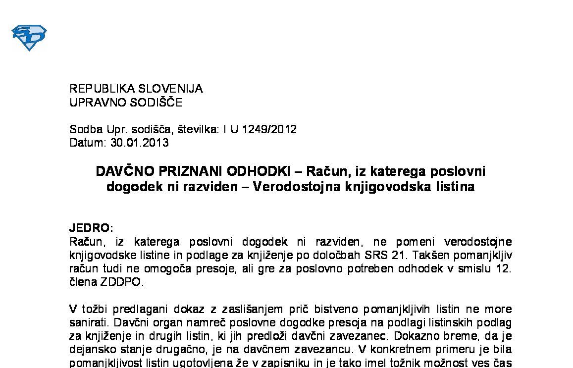 VERODOSTOJNA KNJIGOVODSKA LISTINA – Potni nalog – Dokazovanje nastanka poslovnega dogodka (I U 1898/2021-11) 21.05.2024 14.04.2025