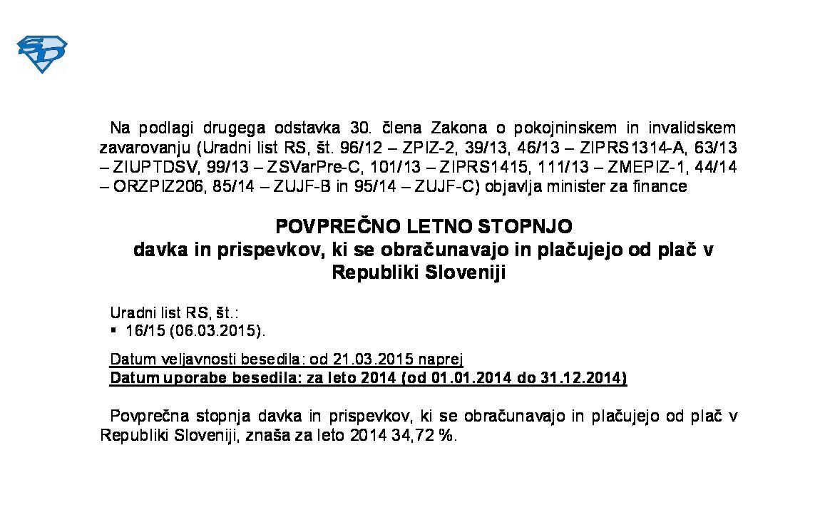 | Povprečna letna stopnja davka in prispevkov, ki se obračunavajo in plačujejo od plač v Republiki Sloveniji (leto 2024) | 01.01.2024 | 31.12.2024 | 10.03.2025 | |