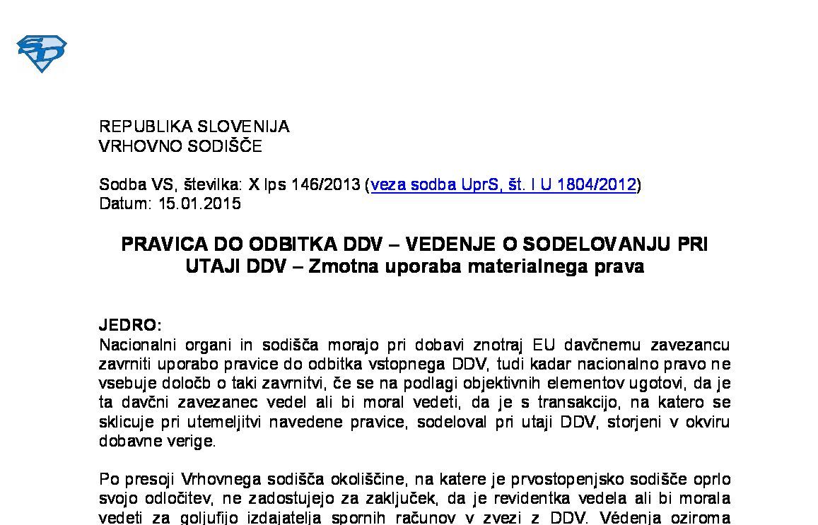 PRAVICA DO ODBITKA DDV – Dokazovanje obstoja goljufije na področju DDV s strani davčnega organa (X Ips 73/2021) 08.03.2023 13.06.2023