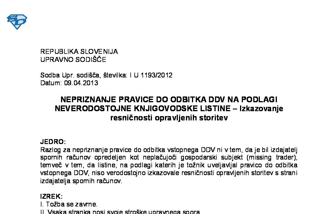 IZPOLNJEVANJE POGOJEV ZA DOBAVO BLAGA ZNOTRAJ UNIJE, OPROŠČENO PLAČILA DDV NA PODLAGI 46. ČLENA ZDDV-1 – Nepopolne CMR listine (I U 1704/2021-38) 27.11.2024 15.10.2025