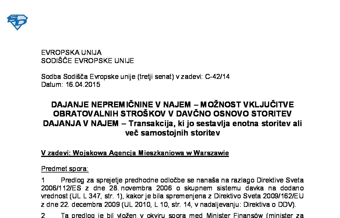 ODBITEK VSTOPNEGA DAVKA - NEPREMIČNINA, KI SE DELNO UPORABLJA ZA NAMENE DEJAVNOSTI IN DELNO ZA ZASEBNE NAMENE (C-434/03) 14.07.2005 02.03.2007