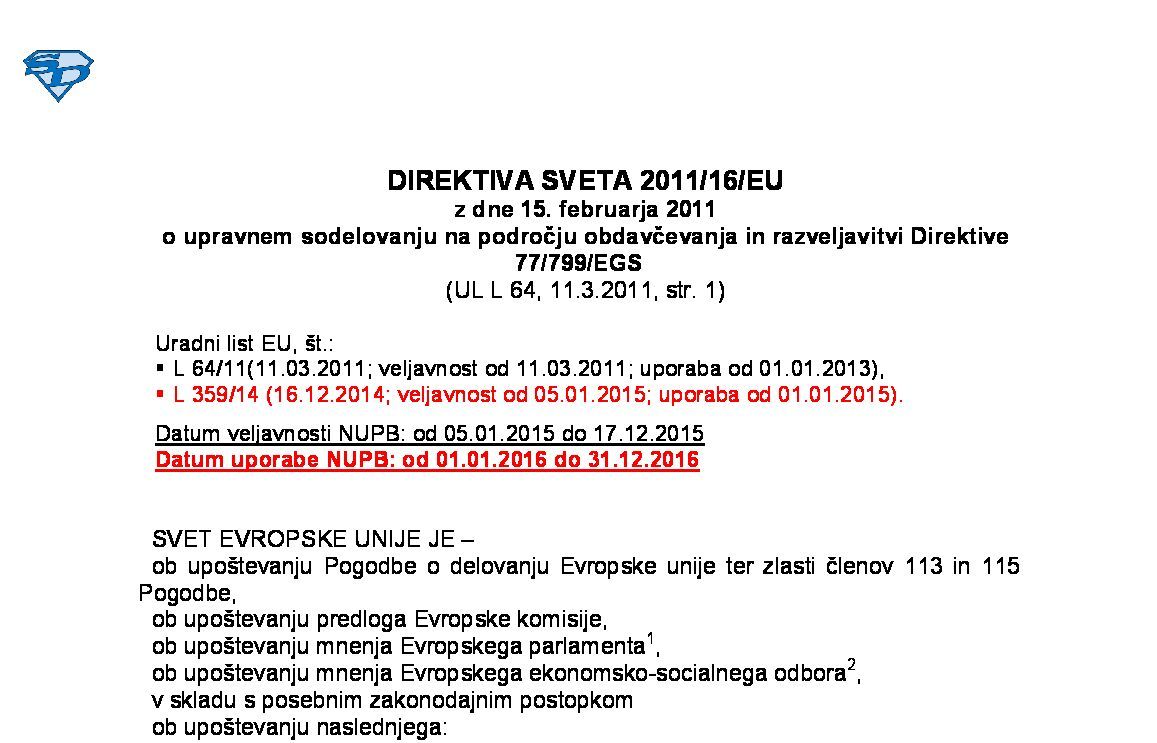 DIREKTIVA SVETA 2011/16/EU z dne 15. februarja 2011 o upravnem sodelovanju na področju obdavčevanja in razveljavitvi Direktive 77/799/EGS (neuradno prečiščeno besedilo) 01.01.2017 04.07.2017 03.02.2016