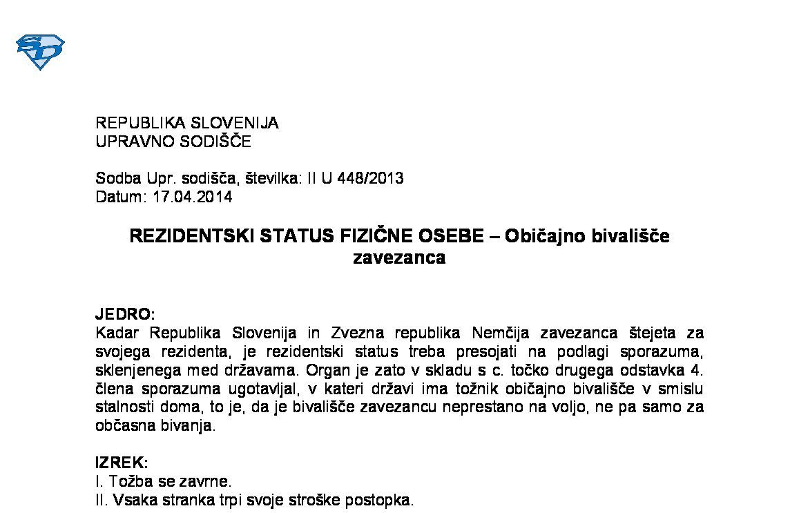 UGOTAVLJANJE REZIDENTSKEGA STATUSA – Dvojno rezidentstvo – Rezidentstvo po KIDO in po ZDoh-2 ( I U 609/2021-7) 17.05.2024 10.06.2025