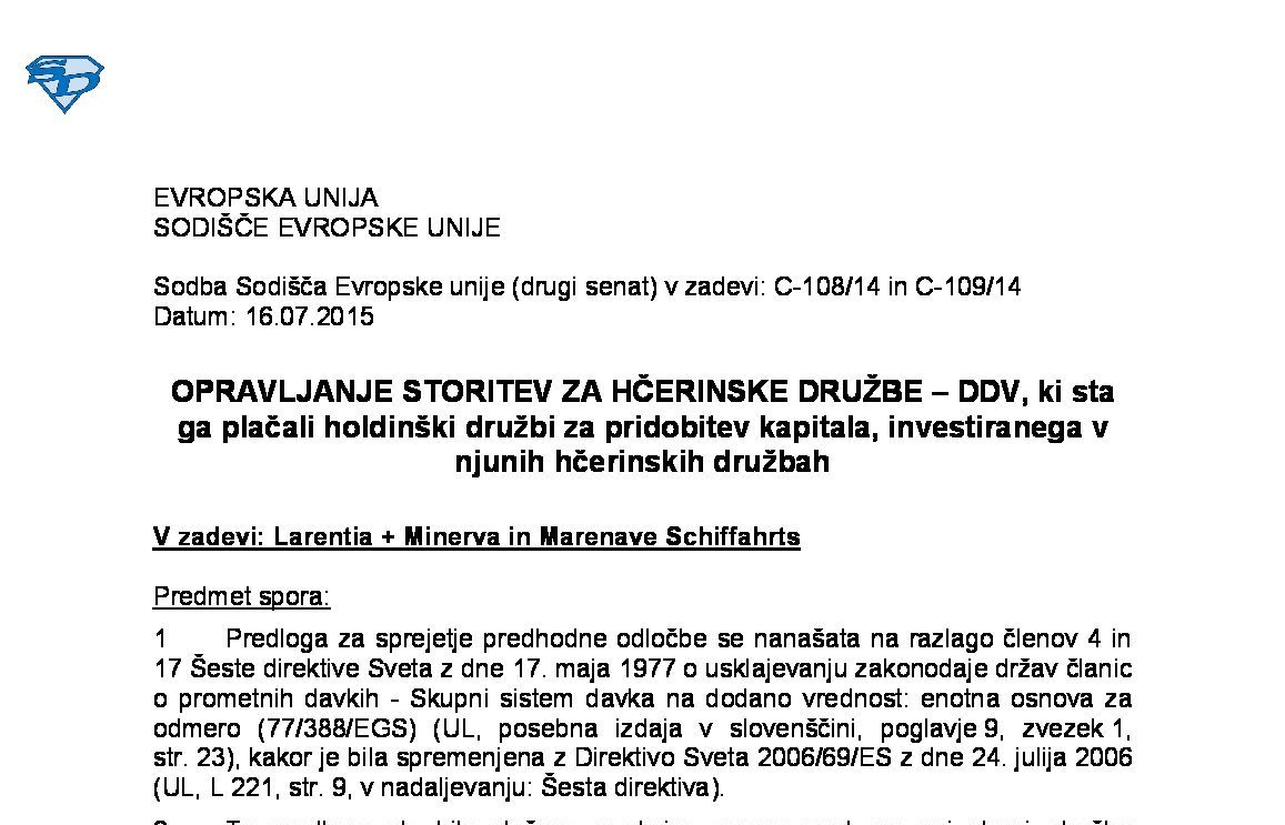 VRAČILO DDV DAVČNIM ZAVEZANCEM, KI NIMAJO SEDEŽA V DRŽAVI ČLANICI VRAČILA – GLAVNA IN POMOŽNA STORITEV – UMETNA DELITEV ENOTNE STORITVE – Neobstoj premestitve predmeta dobave (C-234/24) 23.10.2025 24.10.2025