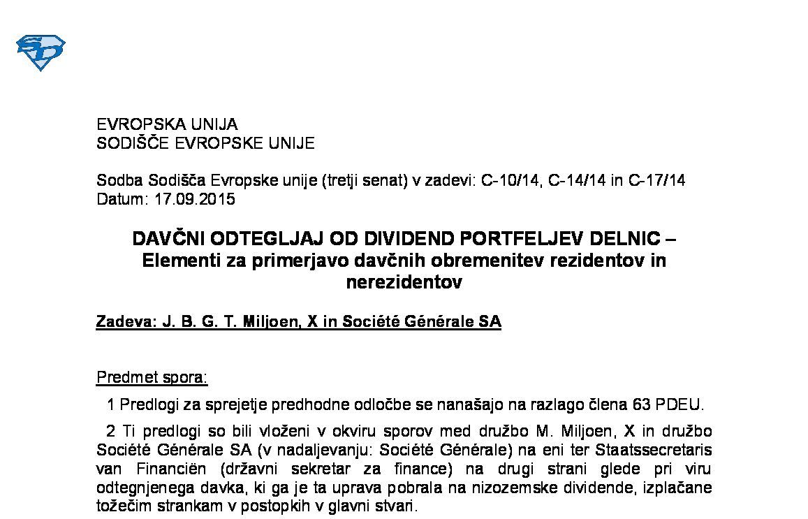 DOHODNINA – IZRAČUN OSNOVNEGA OSEBNEGA ODBITKA ZA VZDRŽEVANEGA OTROKA, KI JE PREJEL POMOČ ZA UČNO MOBILNOST V OKVIRU PROGRAMA ERAZMUS+ – Obdavčitev štipendij za olajšanje mobilnosti fizičnih oseb, na katere se nanaša ta uredba – Omejitev prostega gibanja – Sorazmernost (C-277/23) 16.01.2025 17.01.2025