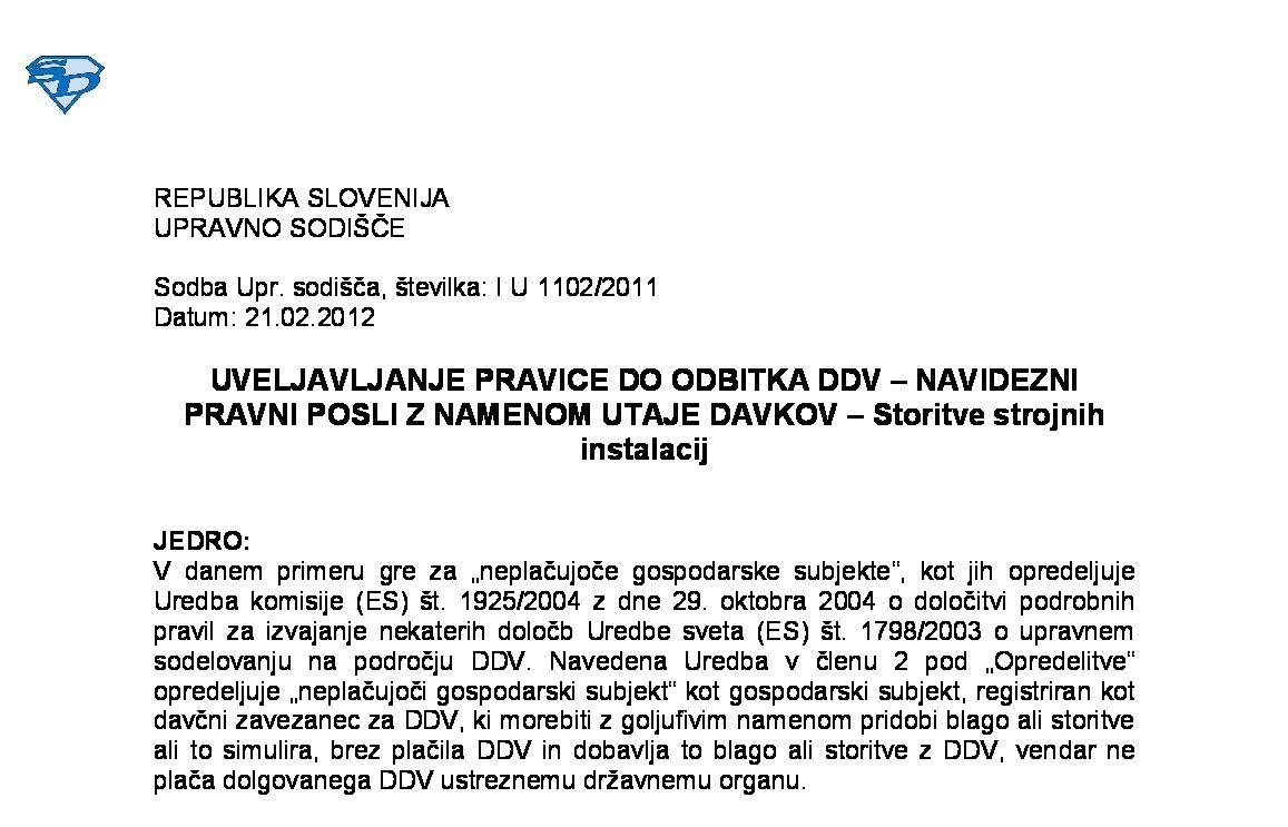 IZPOLNJEVANJE POGOJEV ZA DOBAVO BLAGA ZNOTRAJ UNIJE, OPROŠČENO PLAČILA DDV NA PODLAGI 46. ČLENA ZDDV-1 – Nepopolne CMR listine (I U 1704/2021-38) 27.11.2024 15.10.2025