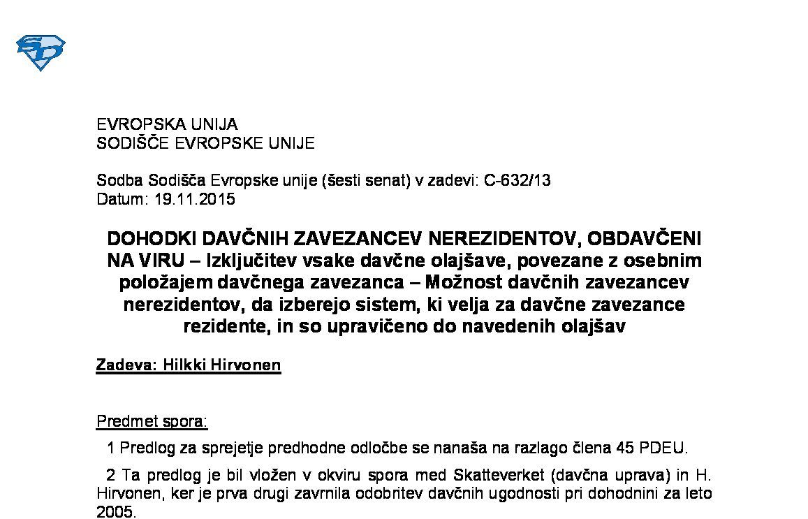 DELAVEC IZ DRŽAVE ČLANICE, KI JE PRENESEL SVOJE STALNO PREBIVALIŠČE V ŠVICO – Davčne ugodnosti – Omejitev na omejeno obdavčljive delavce, ki so rezidenti države članice ali države pogodbenice Sporazuma o EGP – Enako obravnavanje (C-627/22) 30.05.2024 31.05.2024