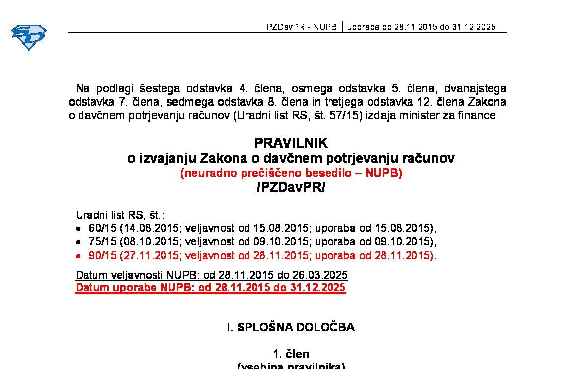 | Pravilnik o izvajanju Zakona o davčnem potrjevanju računov (PZDavPR - neuradno prečiščeno besedilo) | 01.01.2026 | 13.03.2025 | ||