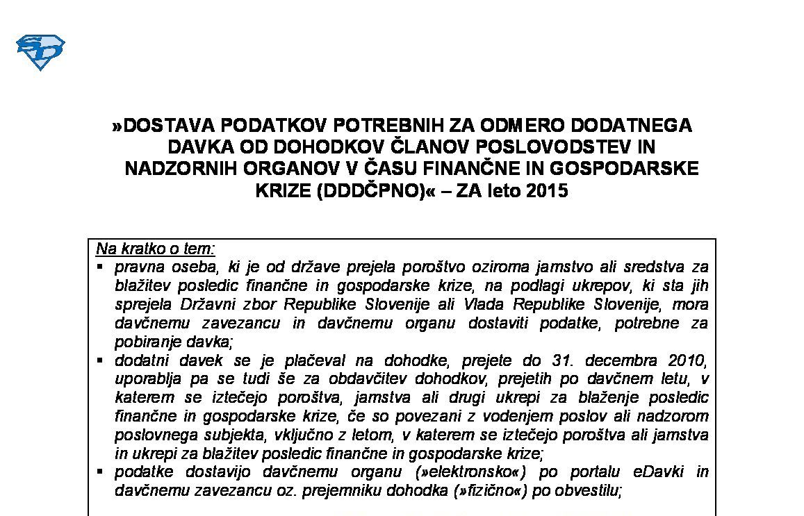 DOSTAVA PODATKOV POTREBNIH ZA ODMERO DODATNEGA DAVKA OD DOHODKOV ČLANOV POSLOVODSTEV IN NADZORNIH ORGANOV (DDDČPNO) V ČASU FINANČNE IN GOSPODARSKE KRIZE - ZA leto 2024 28.01.2025