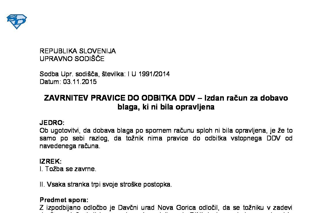 IZPOLNJEVANJE POGOJEV ZA DOBAVO BLAGA ZNOTRAJ UNIJE, OPROŠČENO PLAČILA DDV NA PODLAGI 46. ČLENA ZDDV-1 – Nepopolne CMR listine (I U 1704/2021-38) 27.11.2024 15.10.2025