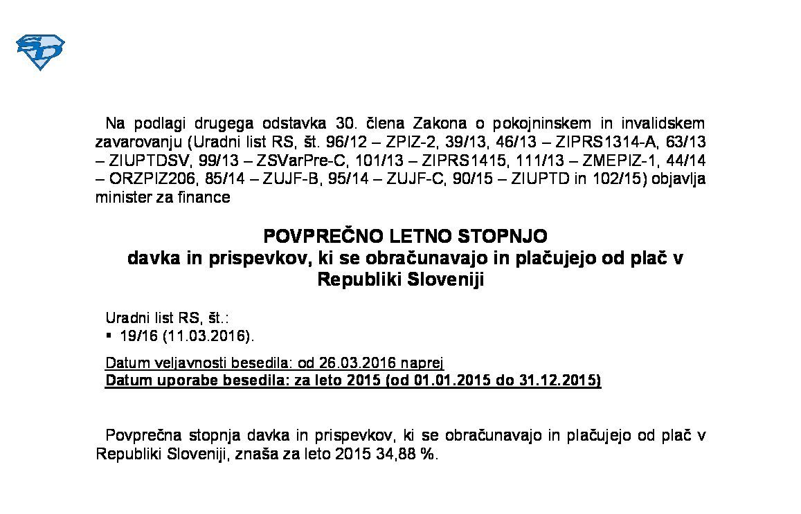| Povprečna letna stopnja davka in prispevkov, ki se obračunavajo in plačujejo od plač v Republiki Sloveniji (leto 2023) | 01.01.2023 | 31.12.2023 | 11.03.2024 | |