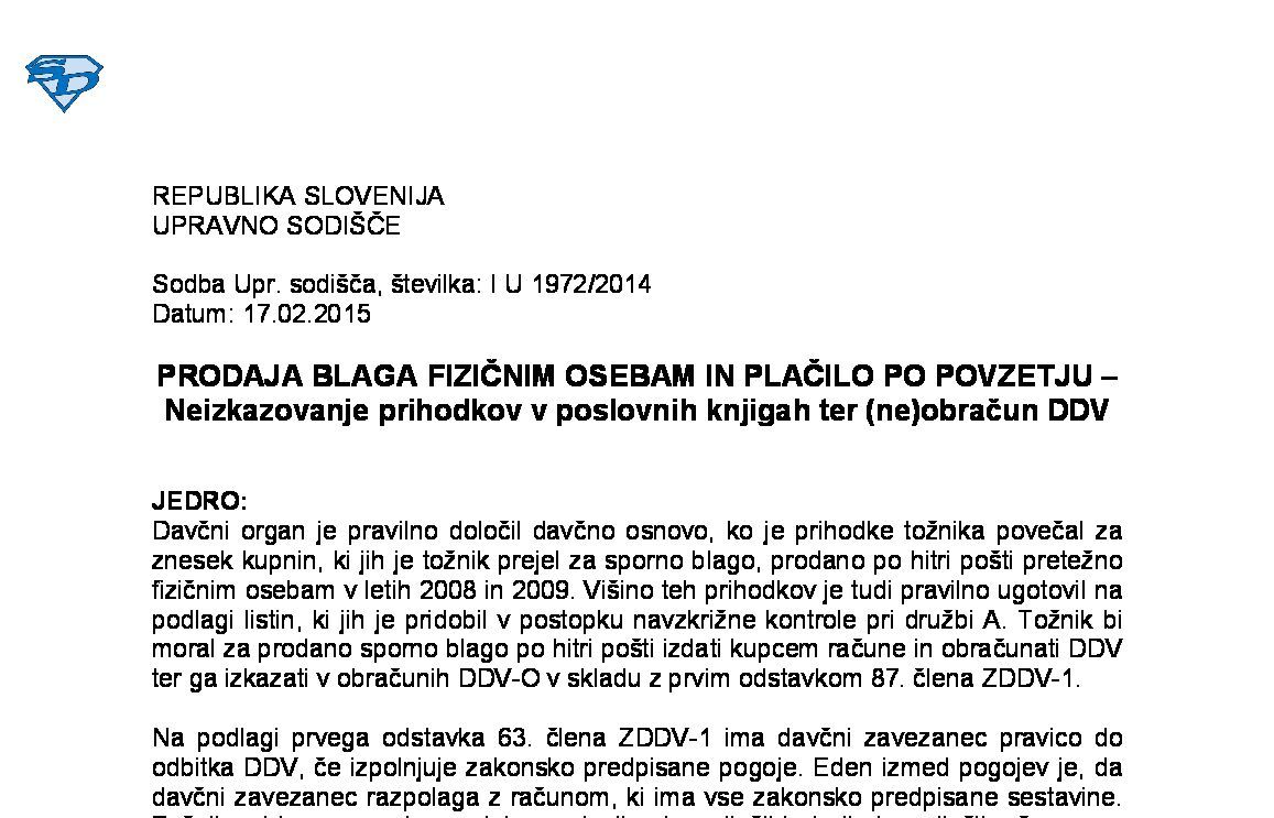 IZPOLNJEVANJE POGOJEV ZA DOBAVO BLAGA ZNOTRAJ UNIJE, OPROŠČENO PLAČILA DDV NA PODLAGI 46. ČLENA ZDDV-1 – Nepopolne CMR listine (I U 1704/2021-38) 27.11.2024 15.10.2025