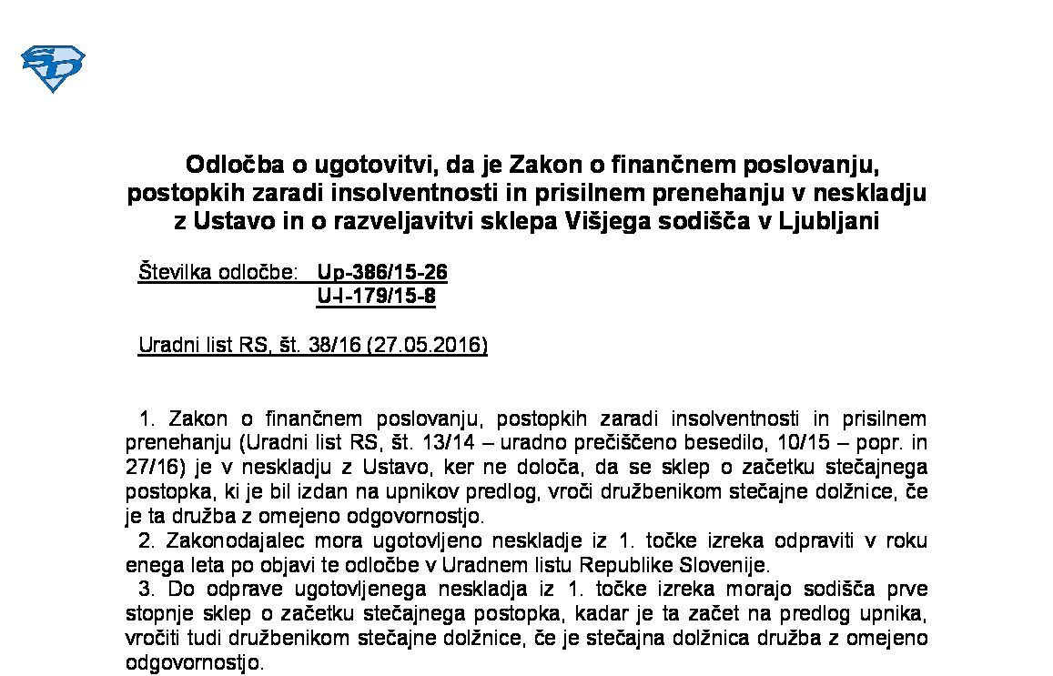 Odločba Ustavnega sodišča - 2. alineja 2. točke drugega odstavka 399. člena v zvezi z 2. točko prvega odstavka in drugim odstavkom 401. člena ZFPPIPP (16.12.2022) 01.12.2022 20.12.2022