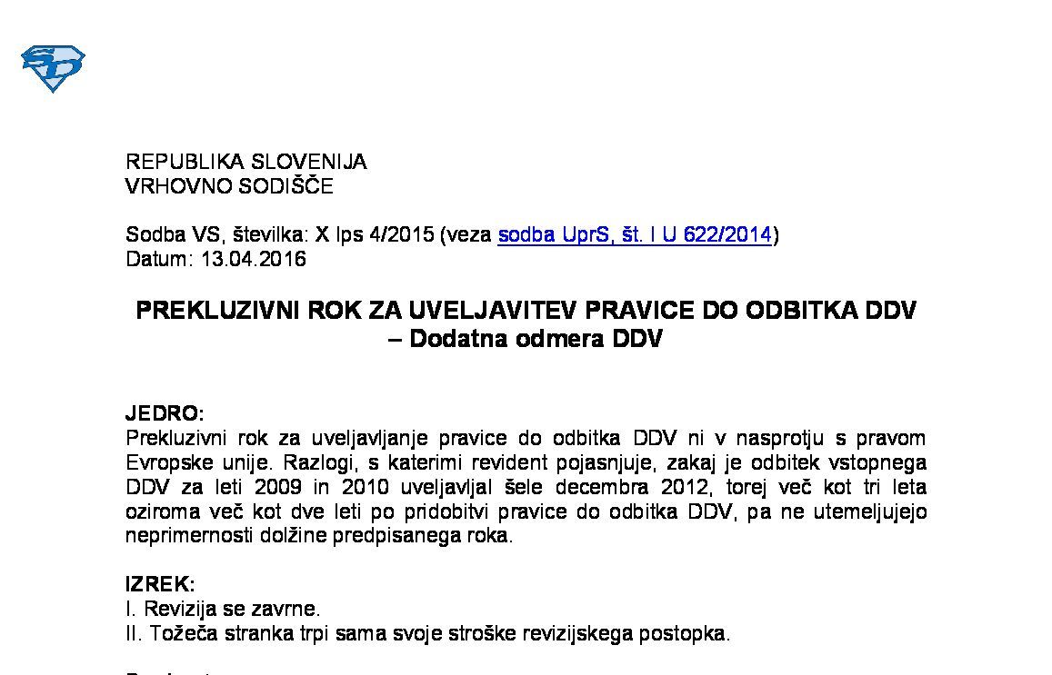 IZDANI RAČUNI ZA OPRAVLJENE POSLOVODNE STORITVE Z OBRAČUNANIM DDV – Pravica do odbitka DDV – Načelo nevtralnosti (X Ips 41/2023) 24.03.2025 28.08.2025