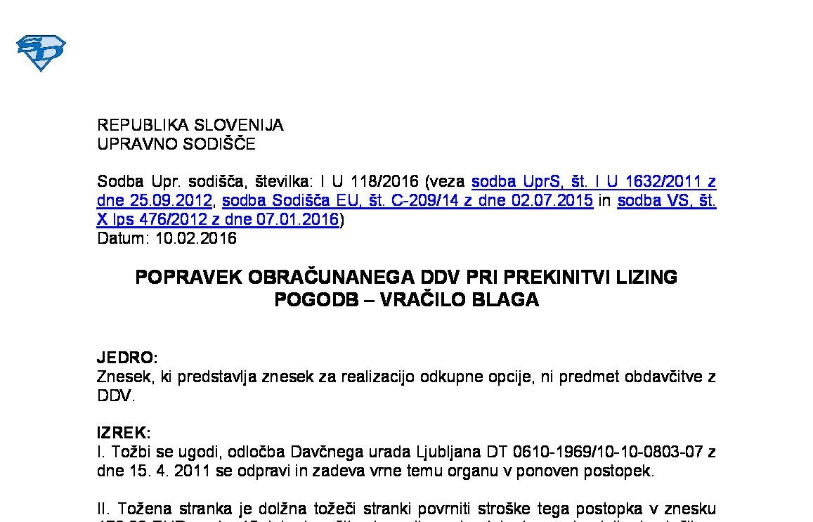 IZPOLNJEVANJE POGOJEV ZA DOBAVO BLAGA ZNOTRAJ UNIJE, OPROŠČENO PLAČILA DDV NA PODLAGI 46. ČLENA ZDDV-1 – Nepopolne CMR listine (I U 1704/2021-38) 27.11.2024 15.10.2025