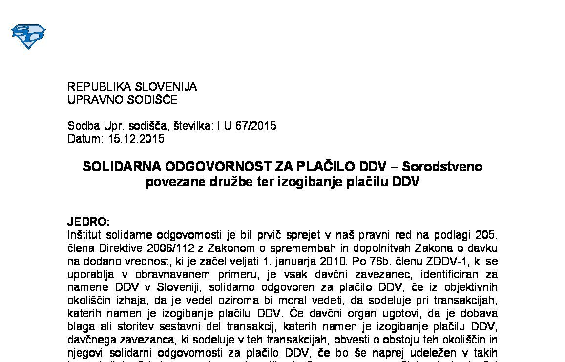 IZPOLNJEVANJE POGOJEV ZA DOBAVO BLAGA ZNOTRAJ UNIJE, OPROŠČENO PLAČILA DDV NA PODLAGI 46. ČLENA ZDDV-1 – Nepopolne CMR listine (I U 1704/2021-38) 27.11.2024 15.10.2025