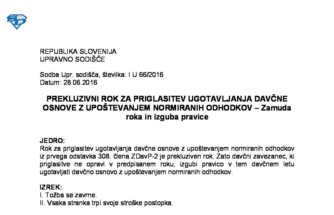 ZASTARANJE PRAVICE DO ODMERE DAVKA – Prekluzija (I U 765/2015) 06.09.2016 16.01.2025