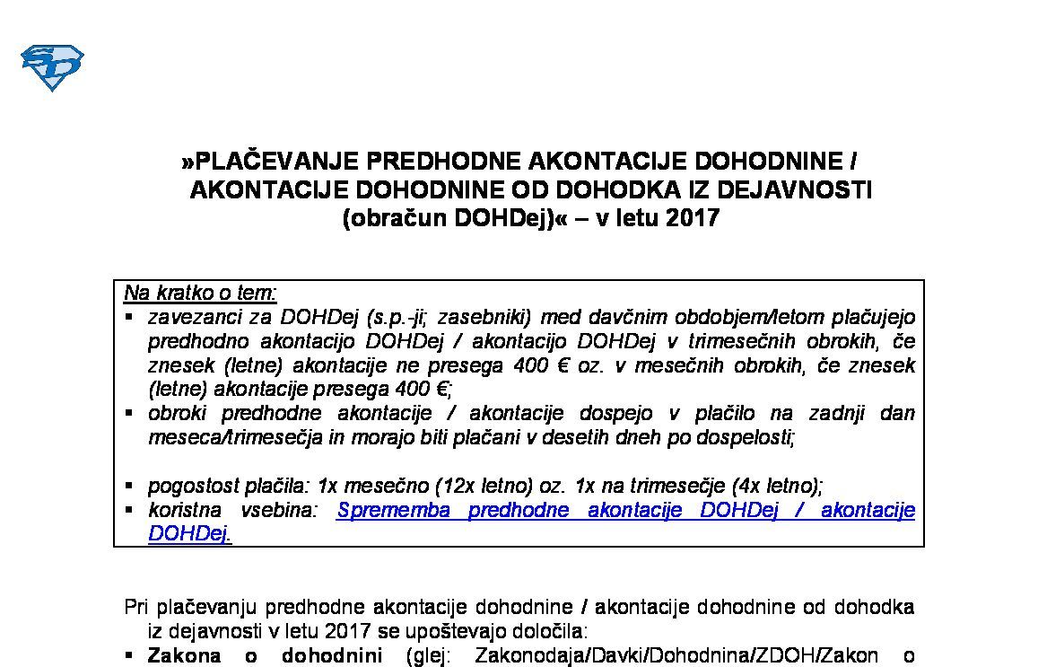 PLAČEVANJE PREDHODNE AKONTACIJE DOHODNINE / AKONTACIJE DOHODNINE OD DOHODKA IZ DEJAVNOSTI (obračun DOHDej) – v letu 2026 12.12.2025