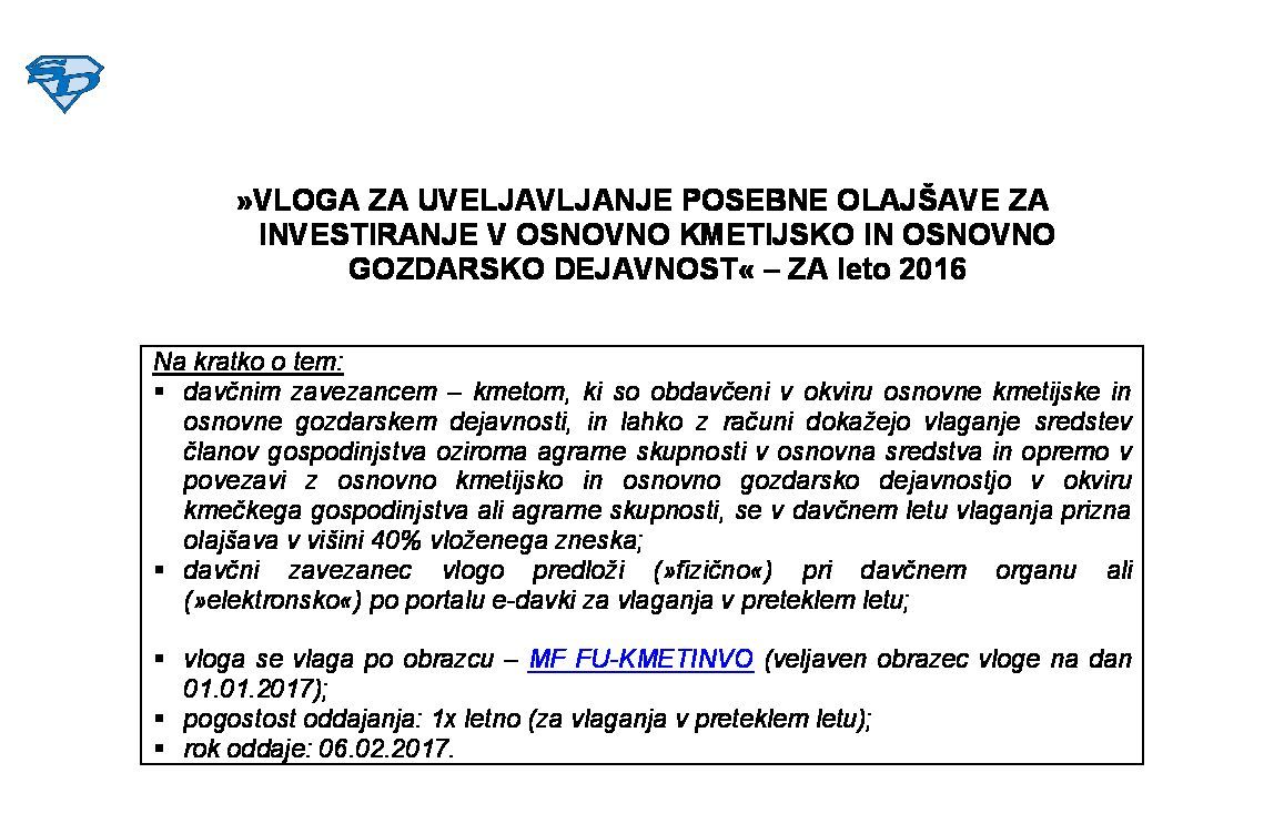 VLOGA ZA UVELJAVLJANJE POSEBNE OLAJŠAVE ZA INVESTIRANJE V OSNOVNO KMETIJSKO IN OSNOVNO GOZDARSKO DEJAVNOST - ZA leto 2025 21.01.2026