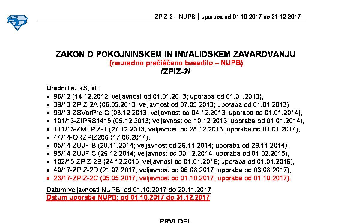 | ZAKON O POKOJNINSKEM IN INVALIDSKEM ZAVAROVANJU (ZPIZ-2- neuradno prečiščeno besedilo) | 03.08.2023 | 31.12.2023 | 17.08.2023 | |