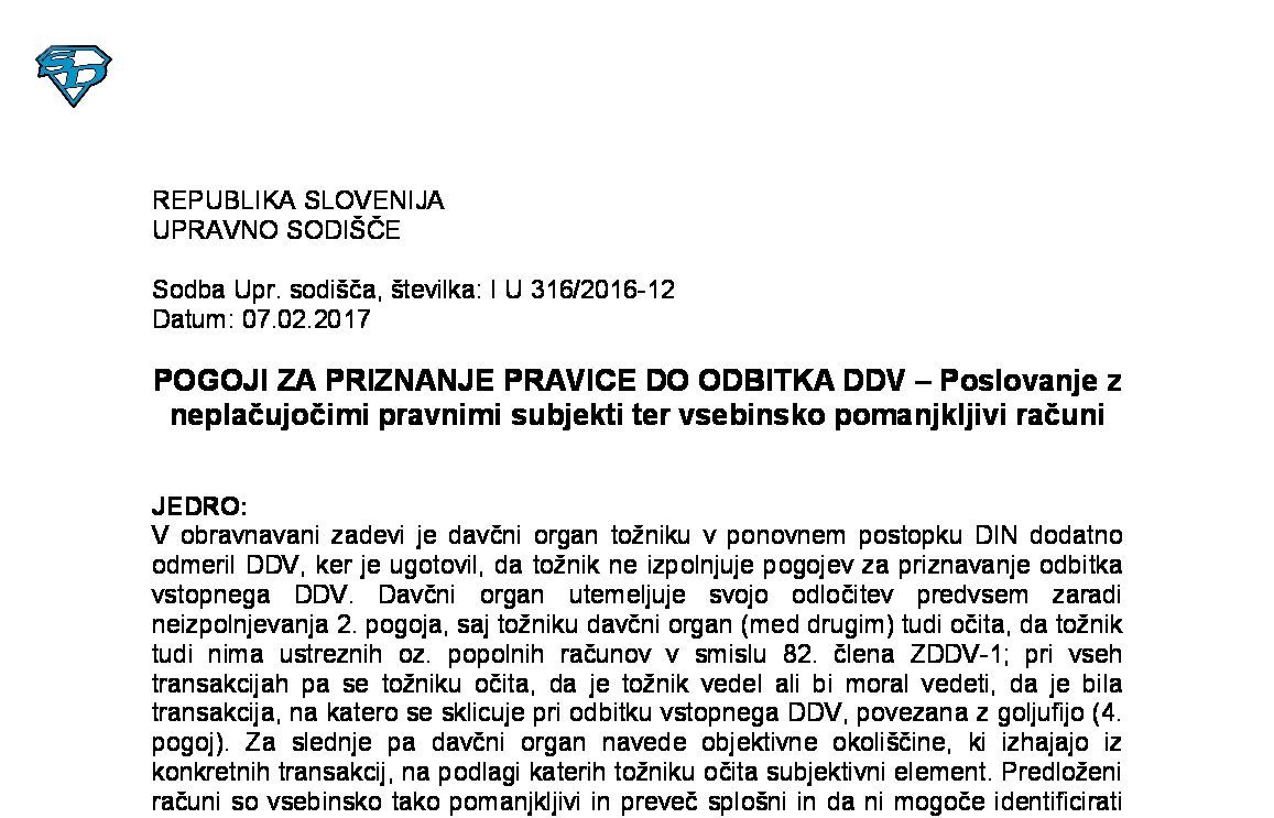 IZPOLNJEVANJE POGOJEV ZA DOBAVO BLAGA ZNOTRAJ UNIJE, OPROŠČENO PLAČILA DDV NA PODLAGI 46. ČLENA ZDDV-1 – Nepopolne CMR listine (I U 1704/2021-38) 27.11.2024 15.10.2025