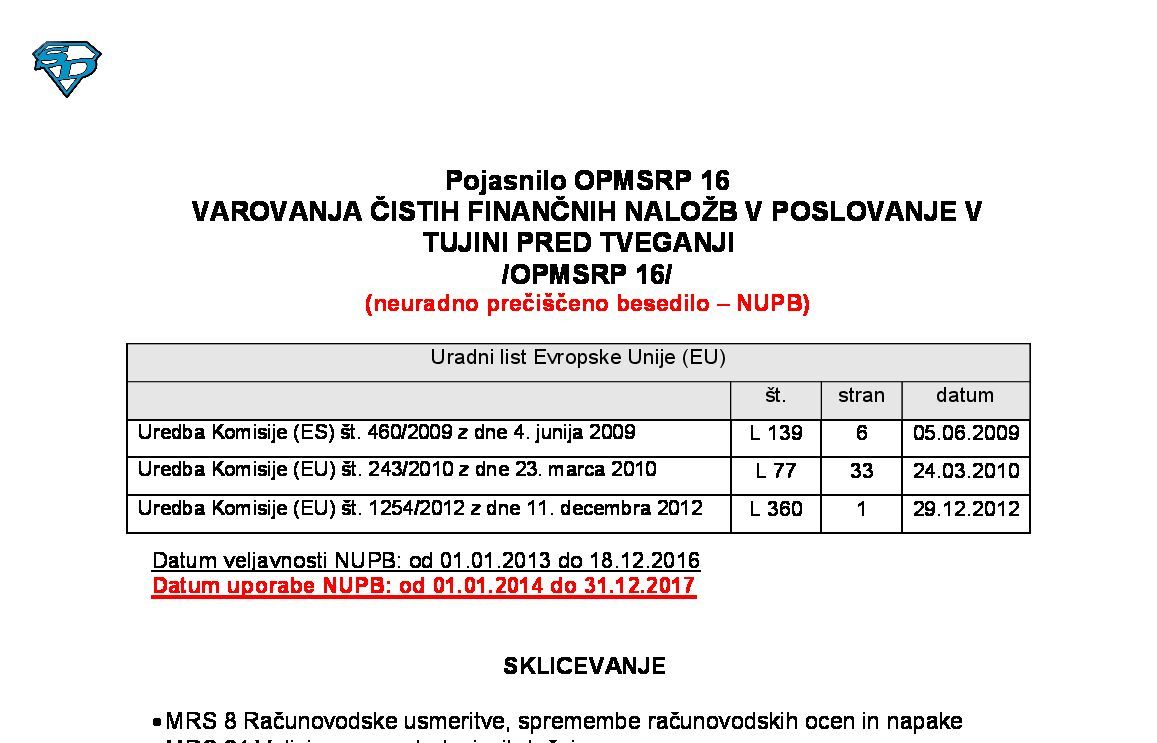 Podjetja začnejo uporabljati NUPB OPMSRP-16 najkasneje z začetkom prvega poslovnega leta, ki se začne 1. januarja 2014 ali kasneje.