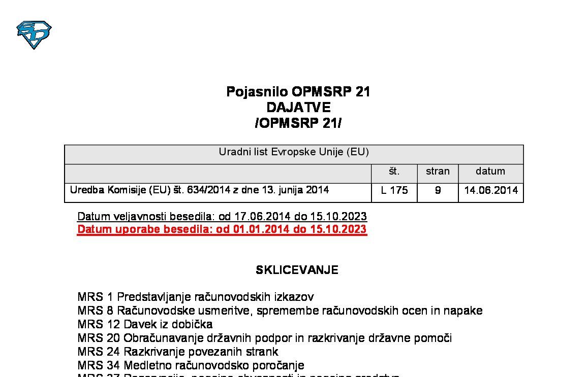 Podjetje uporablja OPMSRP-21 za letna obračunska obdobja, ki se začnejo 1. januarja 2014 ali pozneje. Njegova uporaba pred tem datumom je dovoljena. Če podjetje uporablja OPMSRP-21 za zgodnejše obdobje, mora to razkriti.