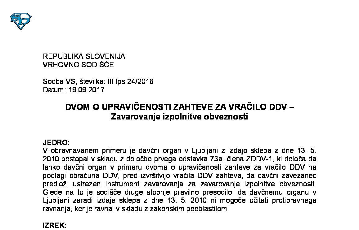 IZDANI RAČUNI ZA OPRAVLJENE POSLOVODNE STORITVE Z OBRAČUNANIM DDV – Pravica do odbitka DDV – Načelo nevtralnosti (X Ips 41/2023) 24.03.2025 28.08.2025
